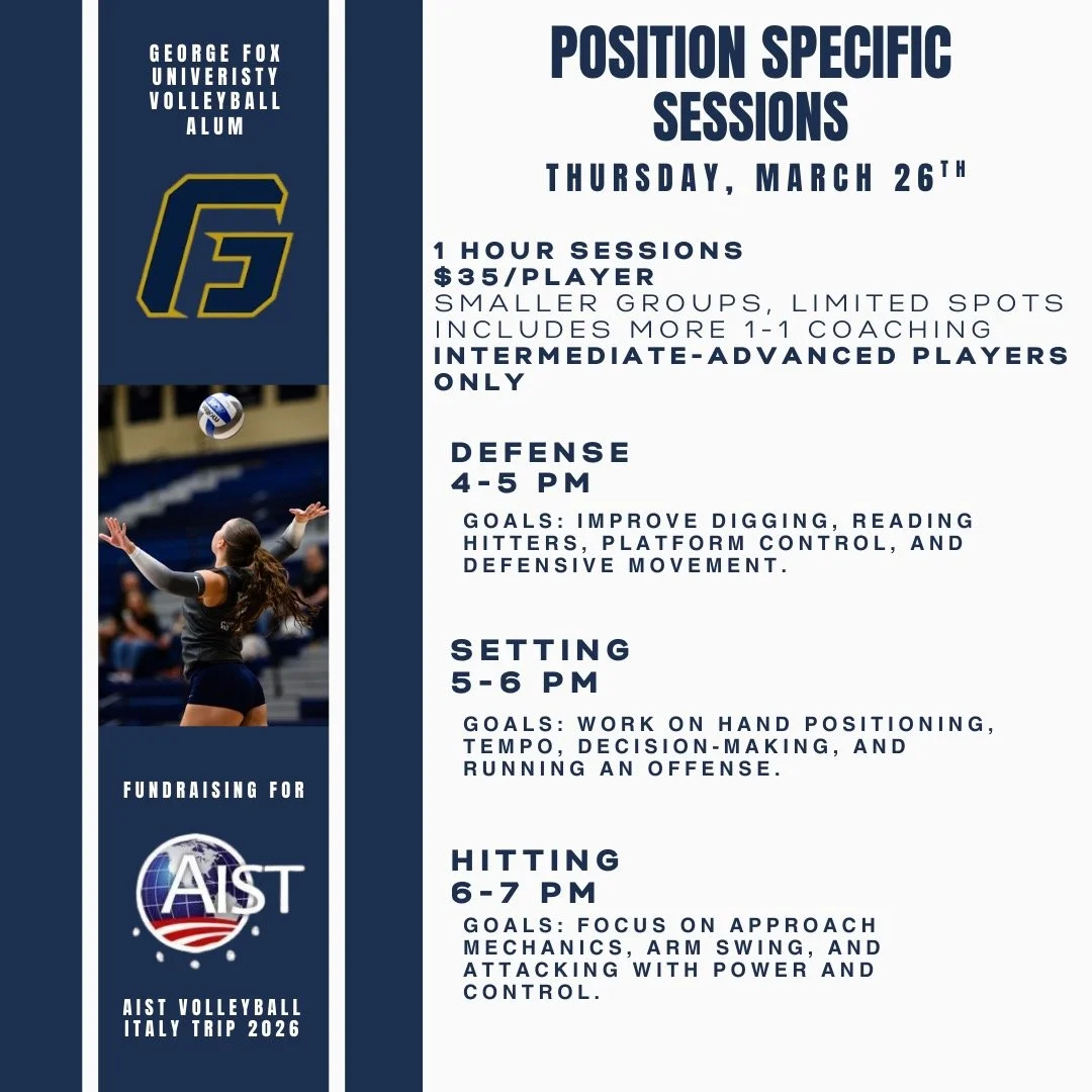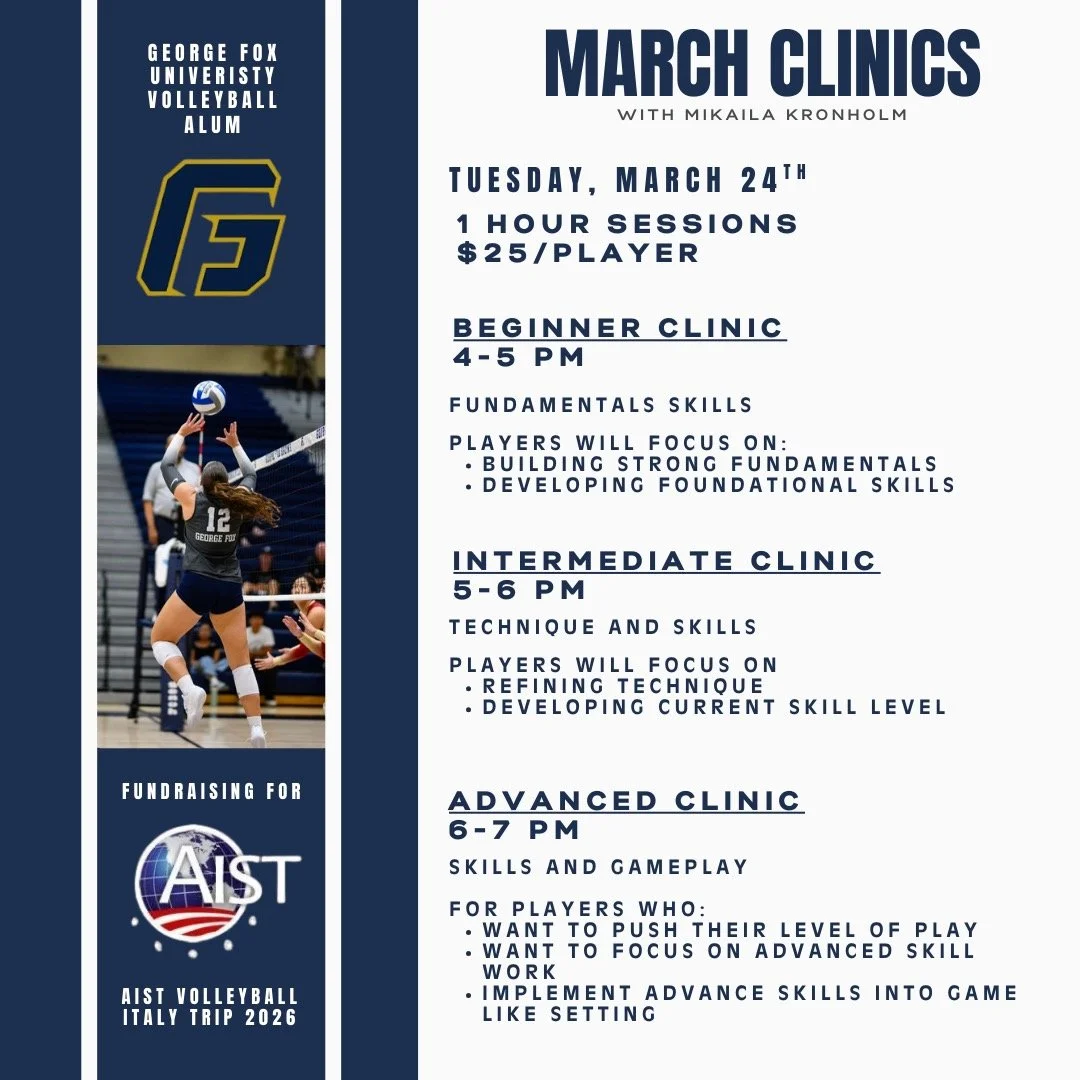 Players will focus on building strong fundamentals and developing a solid volleyball foundation. This clinic will be high-energy, supportive, and fun, with a big emphasis on learning proper technique and growing a love for the game!